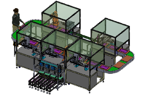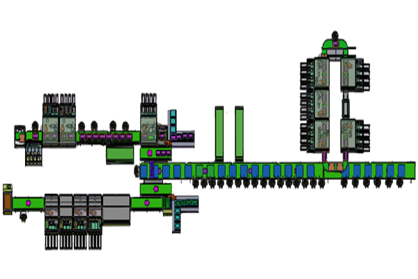 生產線分為三大部分: 1.C板主件生產線+獨立生產出口、連續生產和緩存區 。 2.主板組件生產線+獨立生產出口、連續生產和緩存區 。 3.主線組裝生產線+自動化裝配區 。